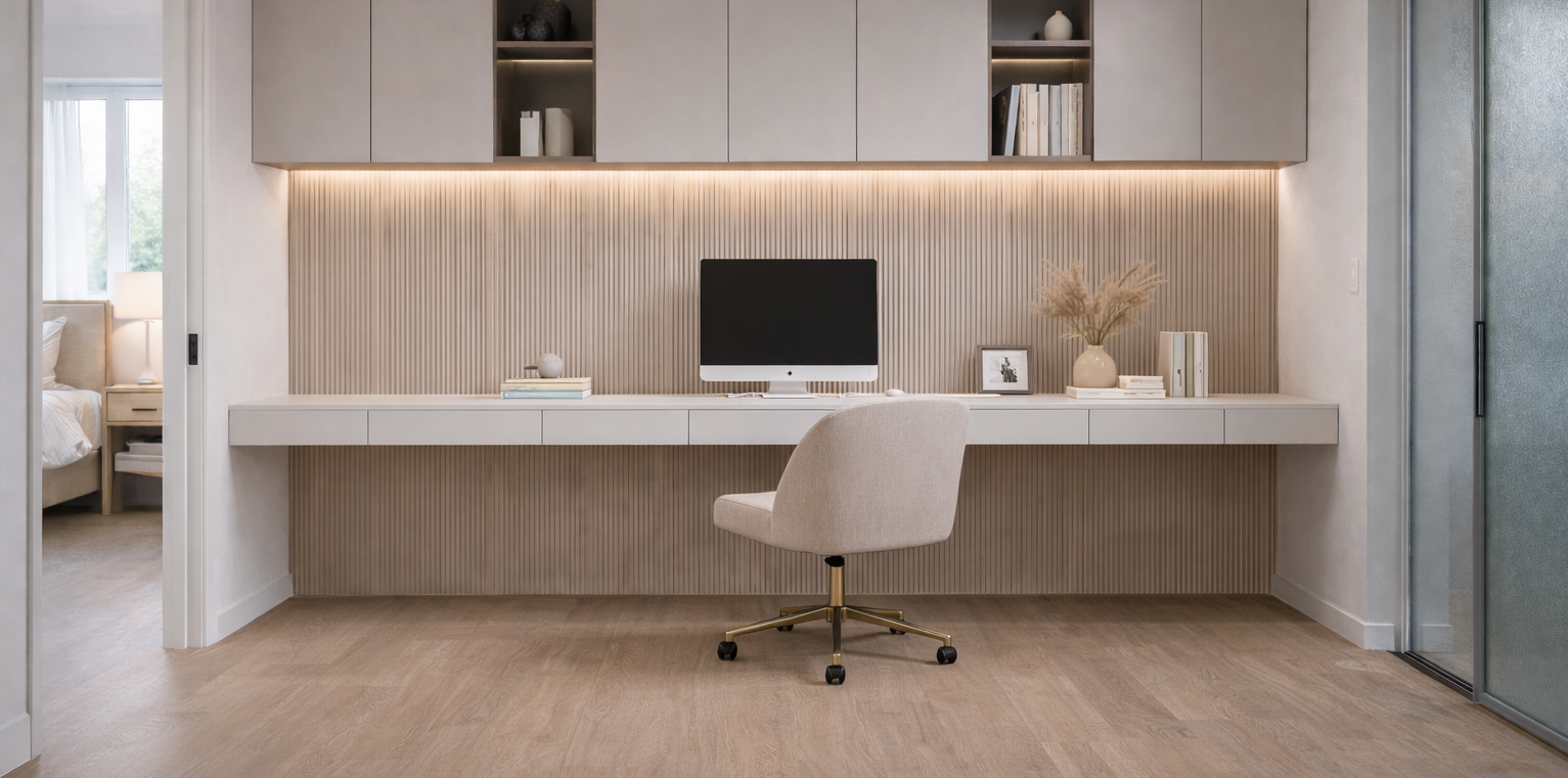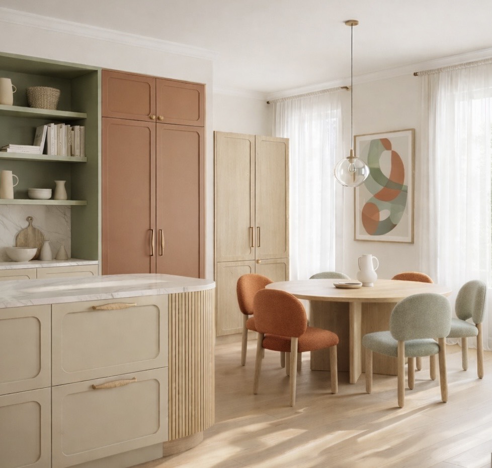 以深藍、霧綠為主的色彩櫃體、自然材質與手作細節,讓空間更沉穩柔和。搭配弧形線條與簡潔分區規劃,營造安靜、有層次、能深呼吸的家,是近期最受青睞的風格方向。